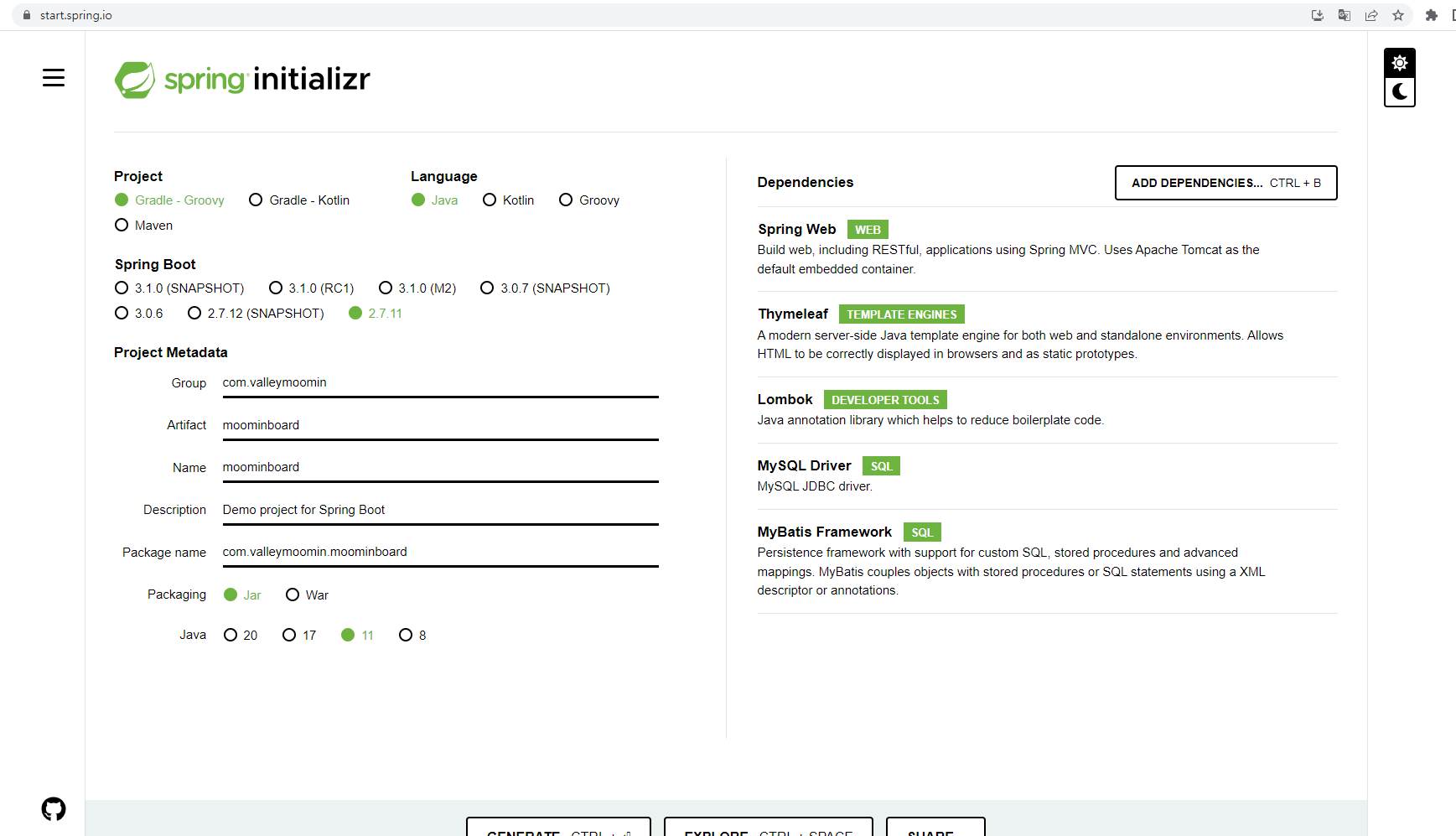 - dependency는 우선적으로 Spring web/thymeleaf/lombok/mysql driver/ mybatis framework를 추가하였습니다.